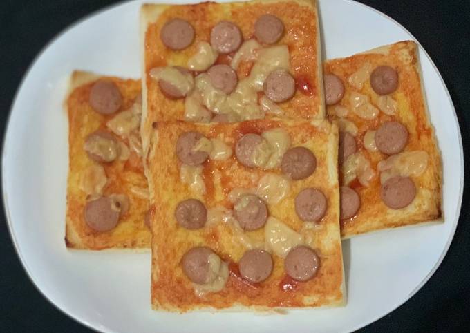 - Panaskan oven terlebih dahulu. Sambil menunggu, Oles masing-masing roti dg 1/2 sdm margarin, lalu oleskan lagi saus tomat dan saus Sambel, sisihkan. Potong-potong sosis sesuai selera.