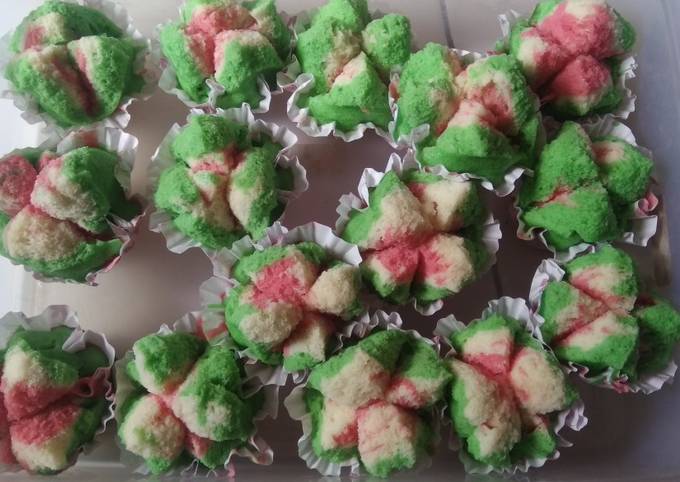 - Siapkan cetakan dan kertas bolu kukus, masukan adonan merah dahulu, baru putih sedikit lalu hijau sedikit. Lakukan hingga adonan habis. Lalu kukus +/- 10 menit (kukusan hrs sudah beruap dan tutupnya diberi kain).