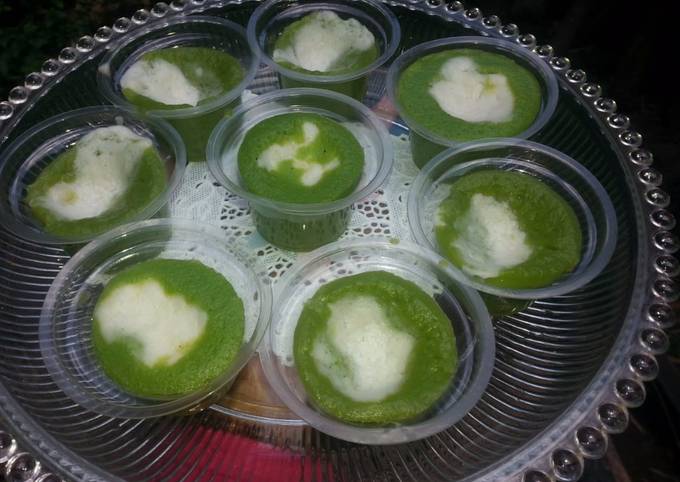 - Siapkan cetakan (*bisa menggunakan cetakan kue mangkuk) lalu tuang adonan 1 (*bahan A) hingga 3/4 bagian. Kemudian ditengahnya tuang adonan 2 (*bahan b) serapi mungkin. Lakukan hingga bahan habis..
